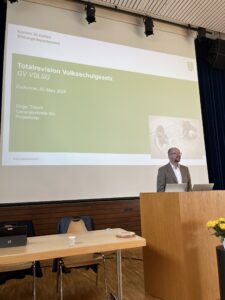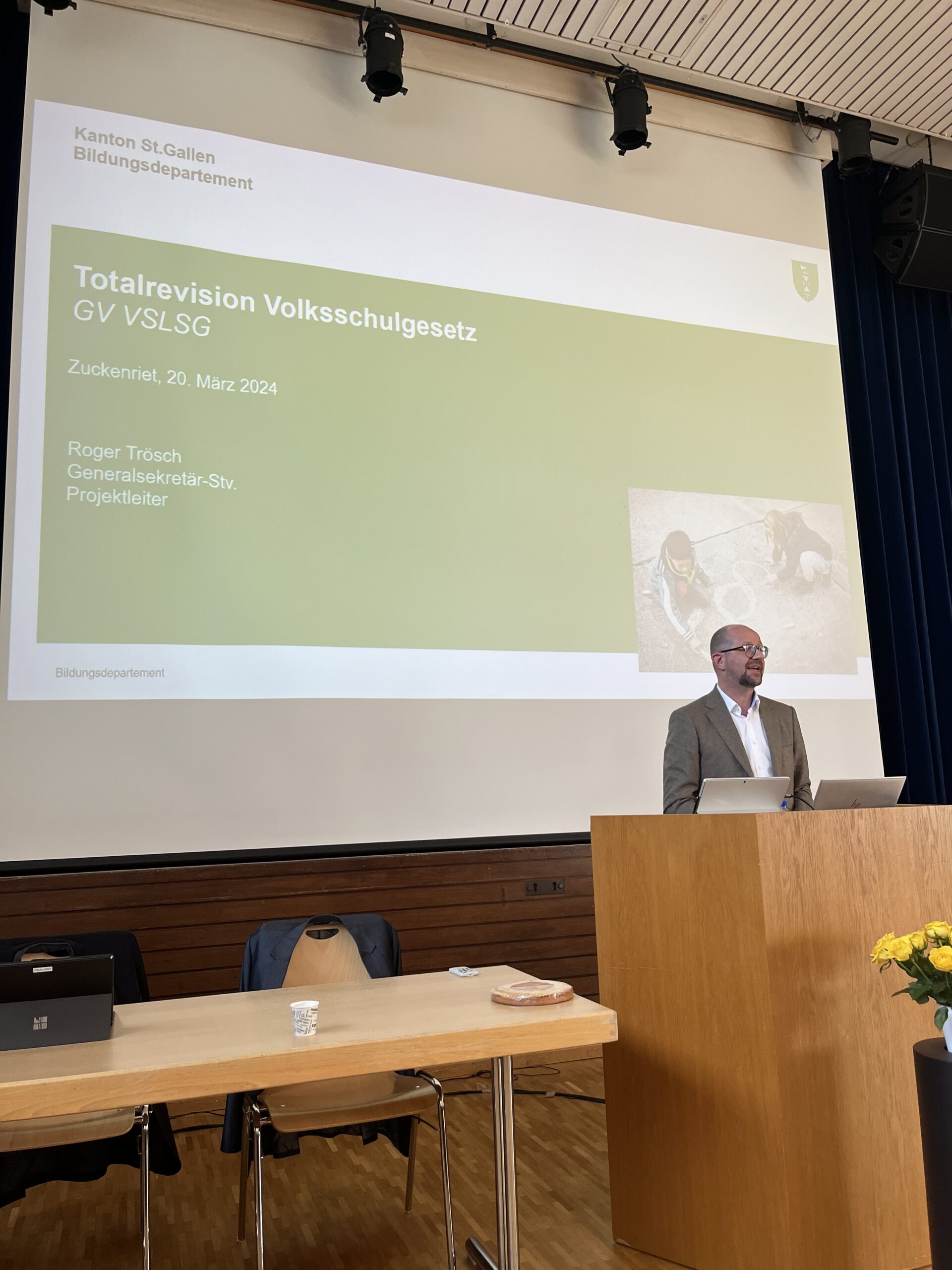 Nach der Begrüssung und den Grussworten der Schulpräsidentin Ursula Künzli und Christoph Ackermann, Präsident SGV, präsentierte Projektleiter Roger Trösch den aktuellen Stand des Projektes zum neuen Volksschulgesetz des Kantons St.Gallen. Im Anschluss wurde in angeleiteter Runde diskutiert und Rückmeldungen zu unterschiedlichen Fragestellungen des neuen Gesetzes gesammelt. Nach der Pause und den Grussworten des scheidenden Regierungsrates Stefan Kölliker, fand der traktanduarische teil statt. Dabei wurde mit Marco Schraner der Nachfolger von Freddy Noser zum Präsidenten gewählt. Michel Bawidamann und Ursi Schweizer wurden ebenfalls aus dem Vorstand verabschiedet. Bettina Wagner und Michael Steinmeier nehmen als neue Mitglieder Einsitz in den Vorstand.